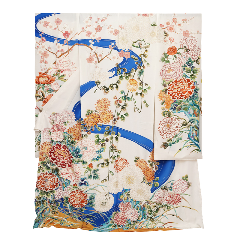 【老舗特選メーカー】特選手描き京友禅本振袖『流水百花』 京都の最高級のお品です。一流の職人による京友禅が施されております。 背中心に流れる清らかな流水に四季の草花が華やかに表現された、大変格調高く、豪華で華やかな雰囲気の振袖。 中心の牡丹の文様はまるで日本画のような職人技が詰め込まれた特別な雰囲気です。 是非とも店頭へお越しくださいませ。